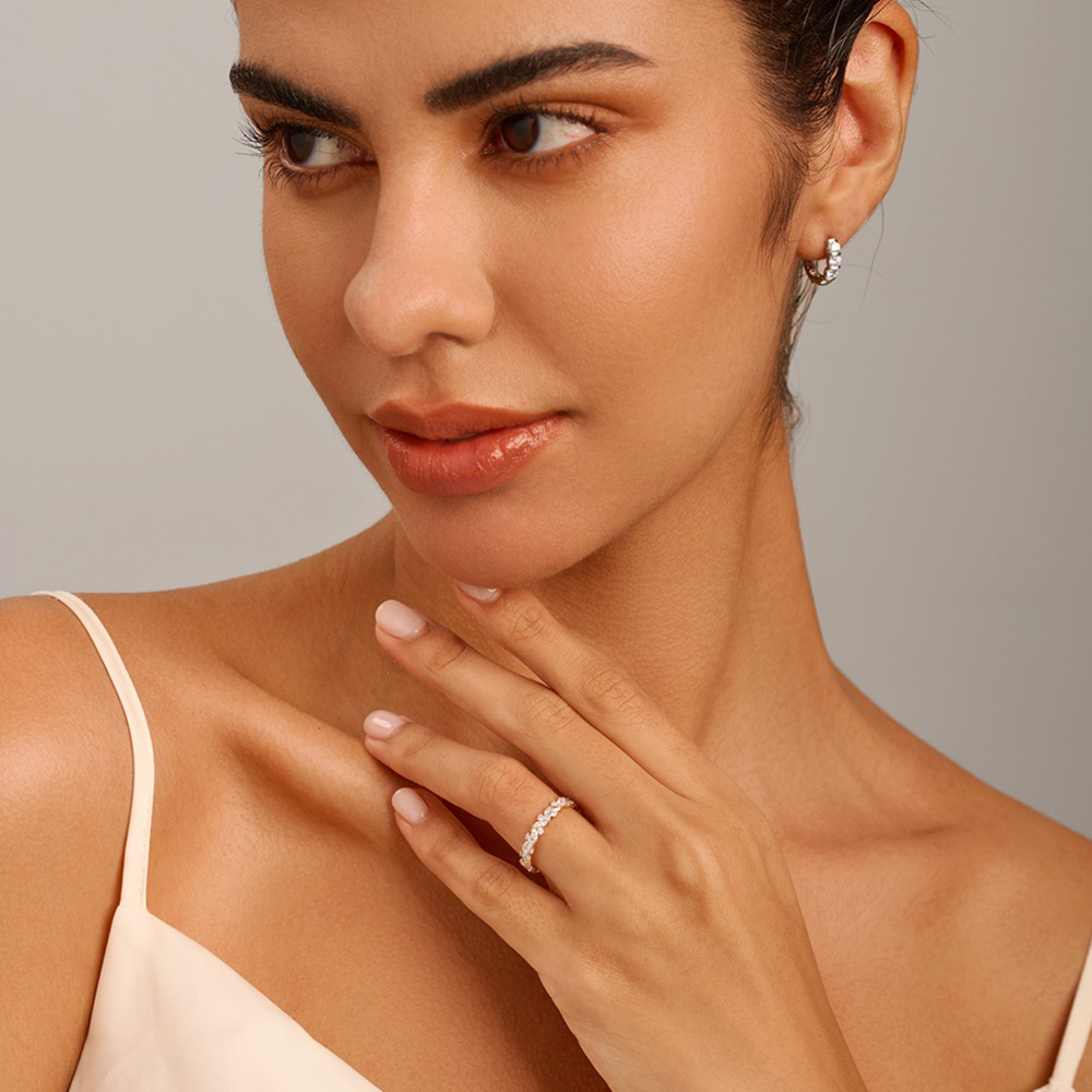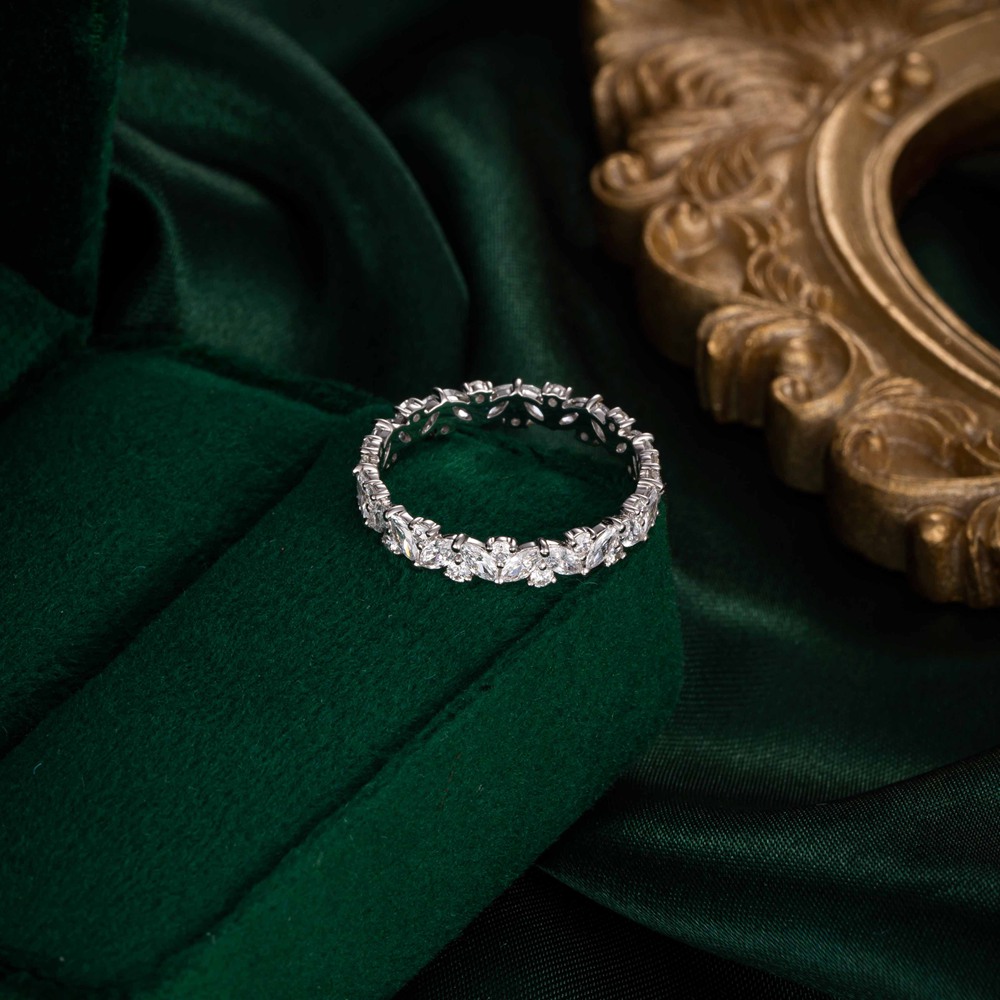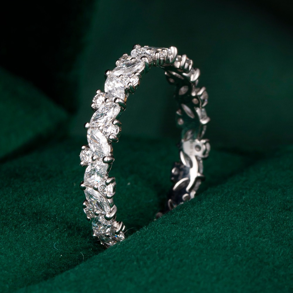 Dieser exquisite Eternity-Ring besticht durch abgestufte Marquise-Diamanten, die in einem ununterbrochenen, glitzernden Kreis angeordnet sind. Die geschickte Größenbestimmung jedes Steins erzeugt einen nahtlosen Fluss der Brillanz. Perfekt als Ehering oder als eigenständiges Statement-Stück.