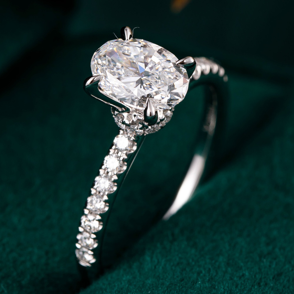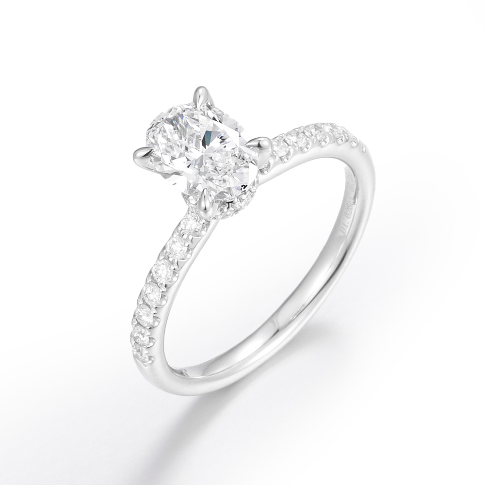 This exquisite engagement ring features a brilliant oval lab-grown diamond center stone embraced by a shimmering halo of pavé diamonds. A perfect symbol of everlasting love and responsible luxury.