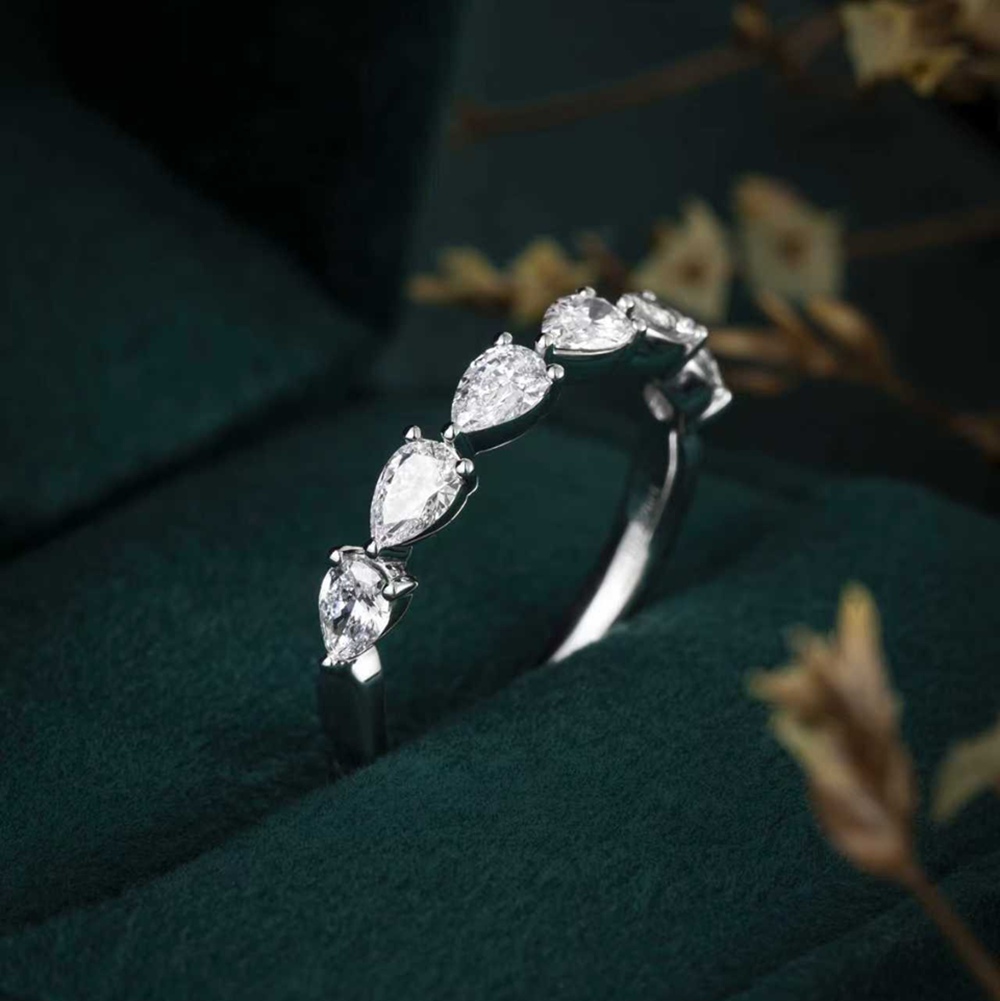 5 つのティアドロップ型のダイヤモンドが、シックでユニークなリングの上部に魅惑的な模様を描きます。