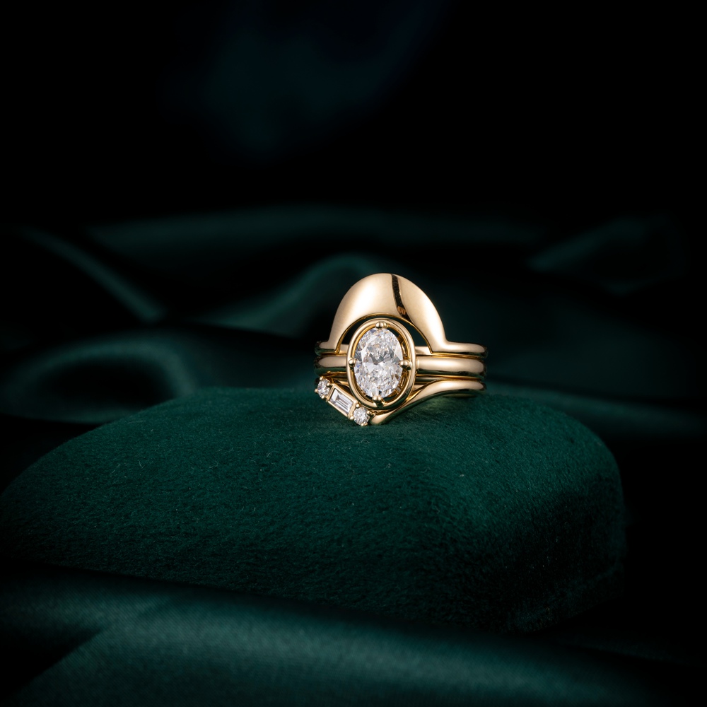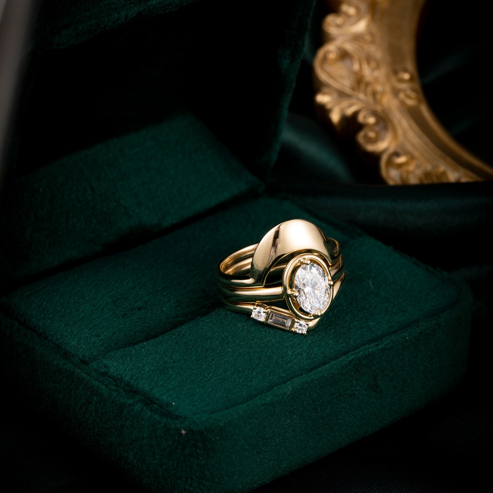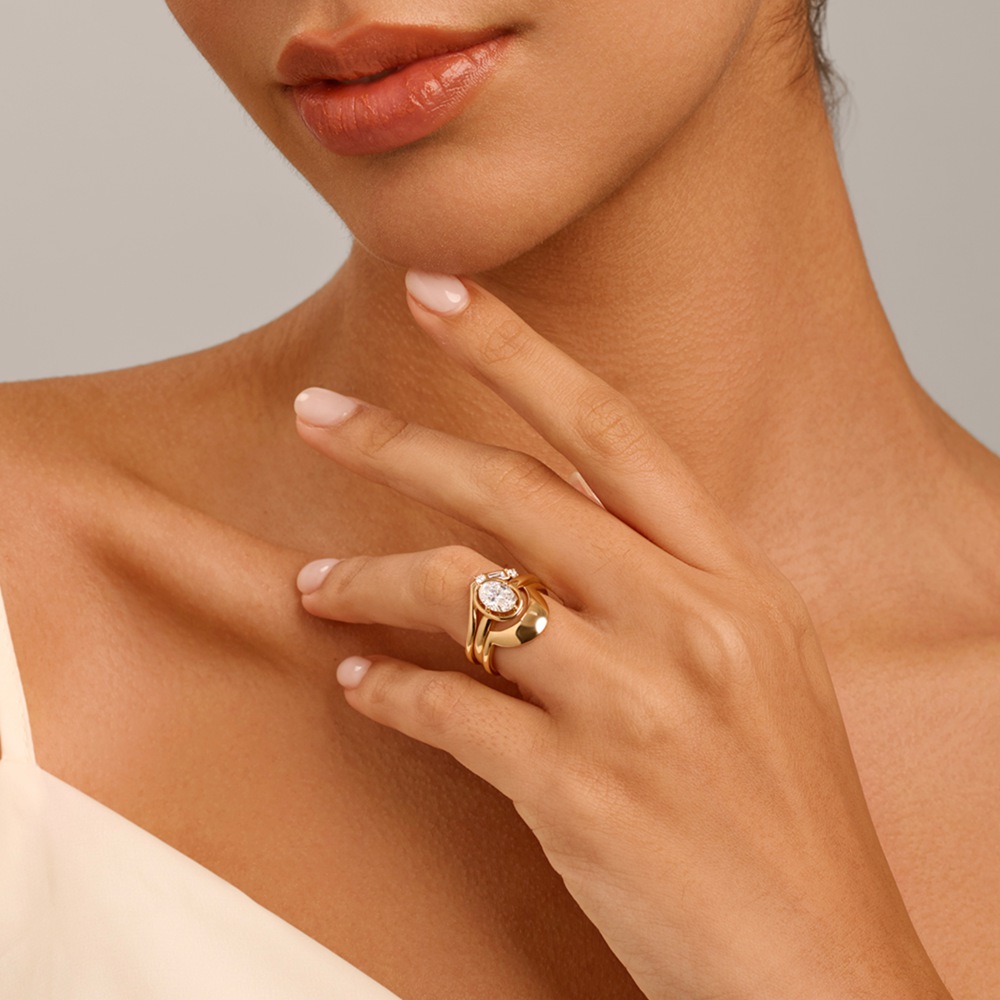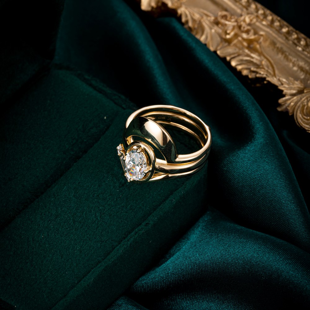 この見事なリングは、中央の宝石を包み込むように絡み合った貴金属のリボンで構成されています。