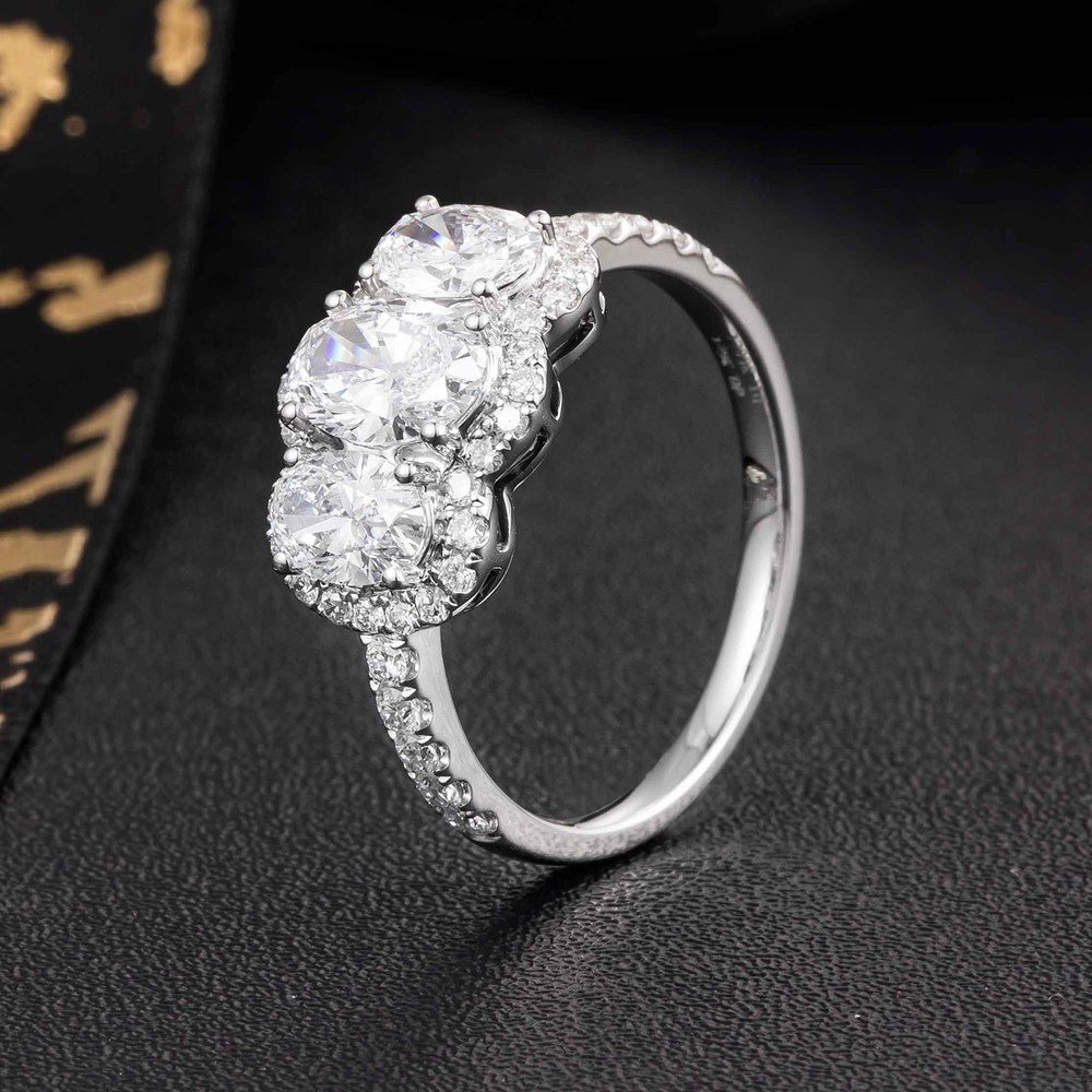スリーストーンオーバルラボグロウンダイヤモンドエンゲージリング(合計1.35カラット)、14K/18Kホワイトゴールド、イエローゴールド、ローズゴールド、またはプラチナ製