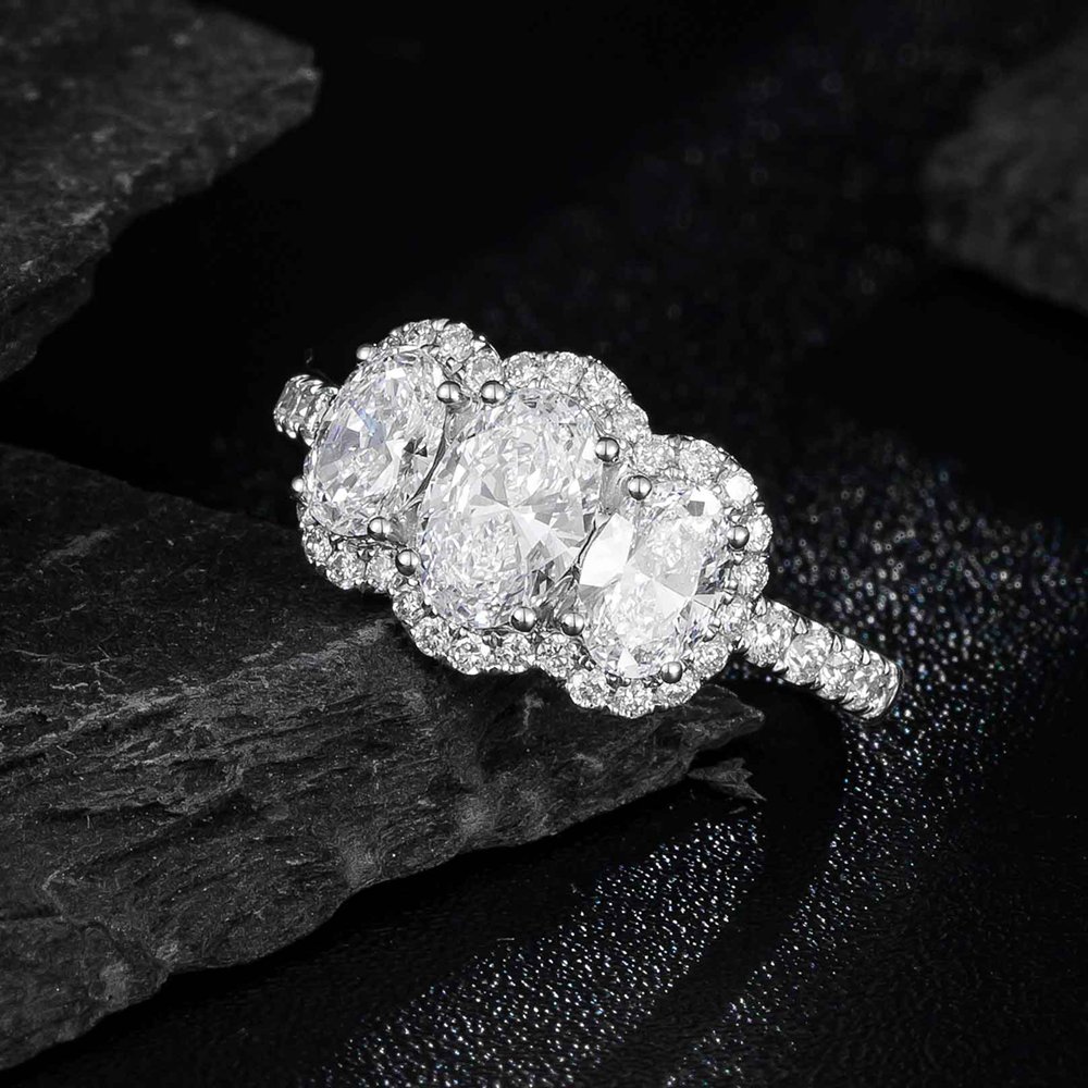 この時代を超越したモダンな 3 ストーン リングは、センター ストーンの両側に 2 つのオーバル ダイヤモンドを配したプロング セット シャンクが特徴です。