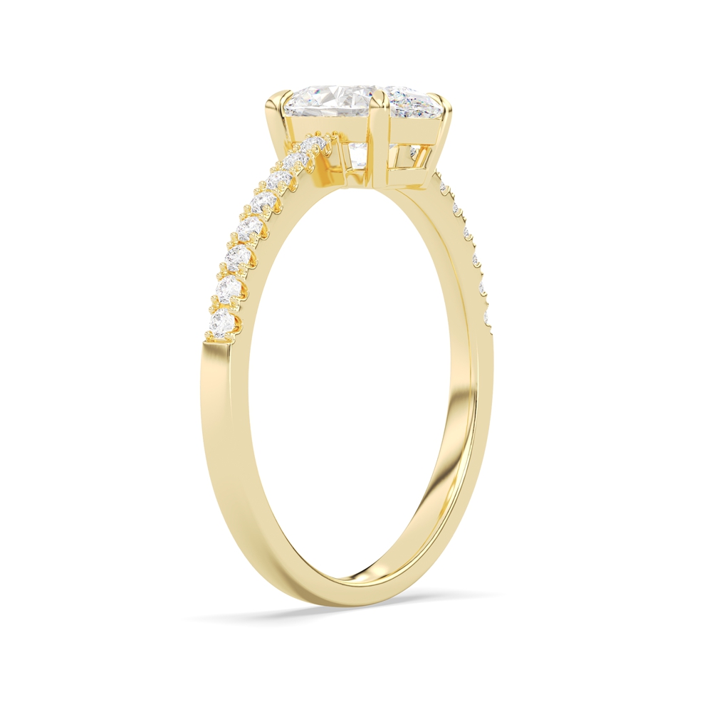 This ring sparkles with classic brilliance, featuring a 1-3 carat oval-cut lab-grown diamond at its center (side stones weigh 0.28 carats).