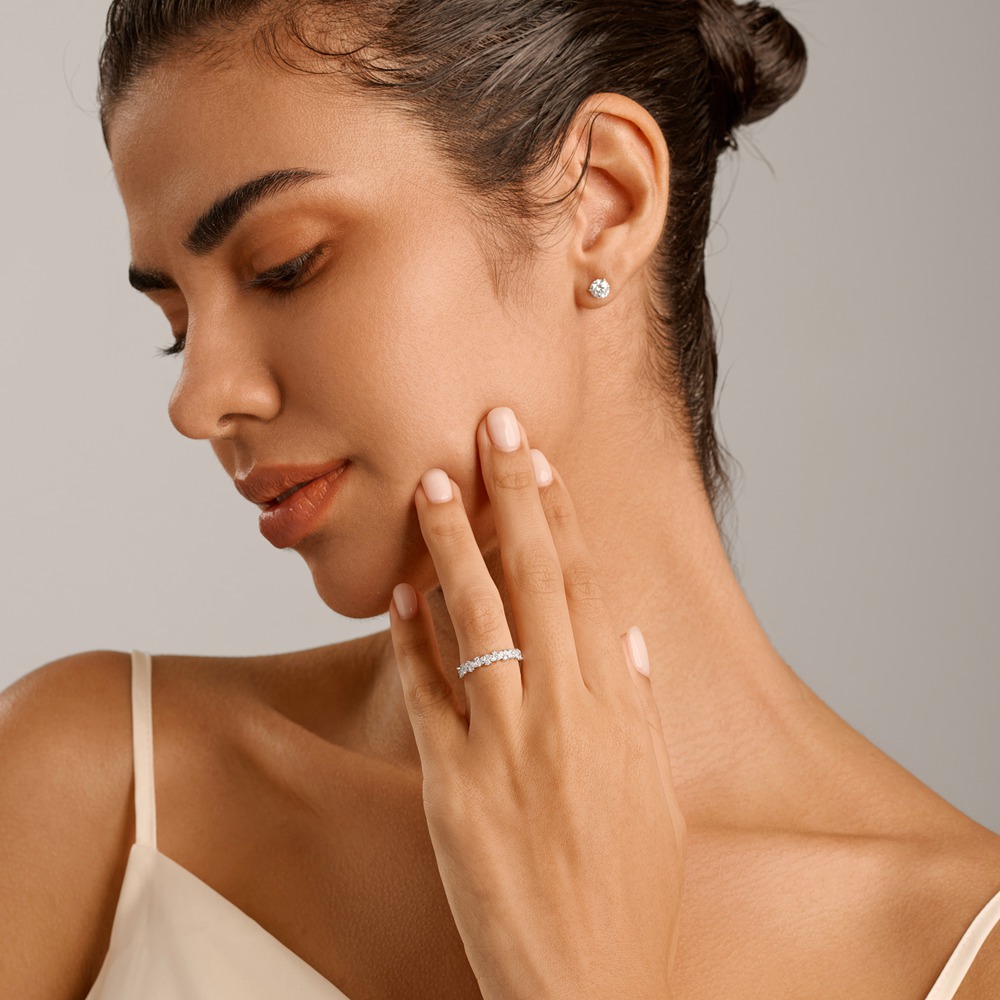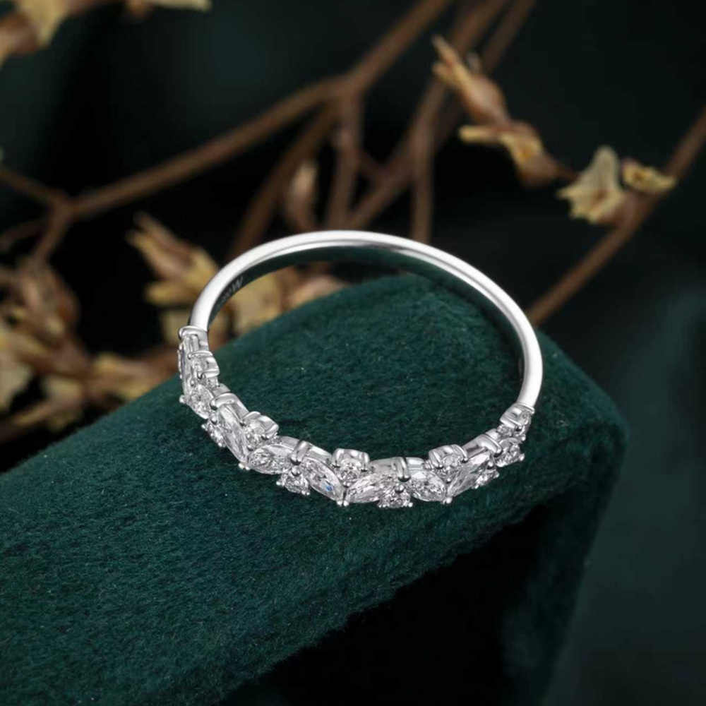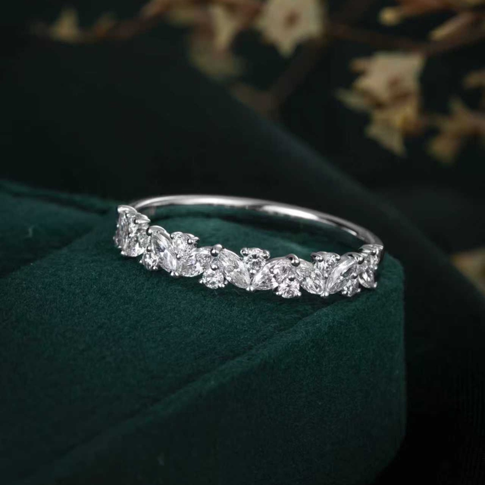 This modern eternity ring showcases an elegantly curved design, meticulously arranged with marquise and round laboratory-grown diamonds. The flowing shank creates a sense of responsible luxury, perfect for marking an everlasting commitment.
