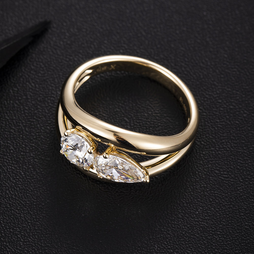 This modern ring features a captivating duo of lab-grown diamonds—a round brilliant and a pear-cut stone—set in warm in 14K/18K White Gold, Yellow Gold, Rose Gold & Platinum . The intentional asymmetrical design creates a dynamic and artistic statement, symbolizing a unique and harmonious bond.