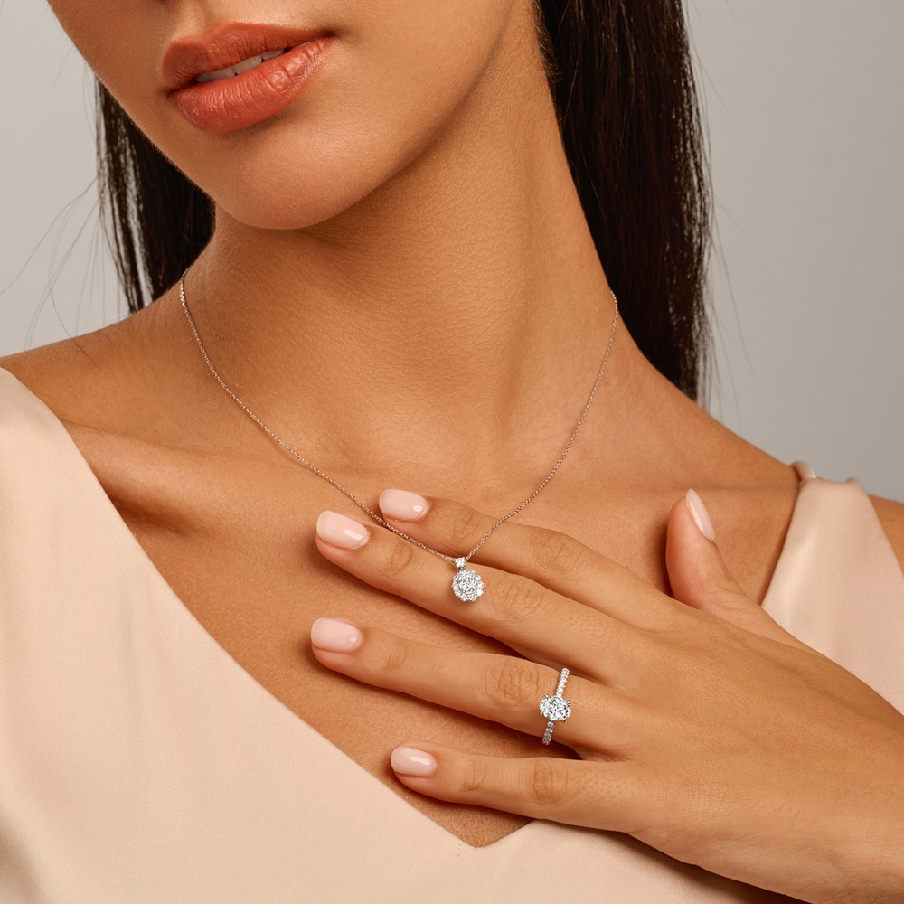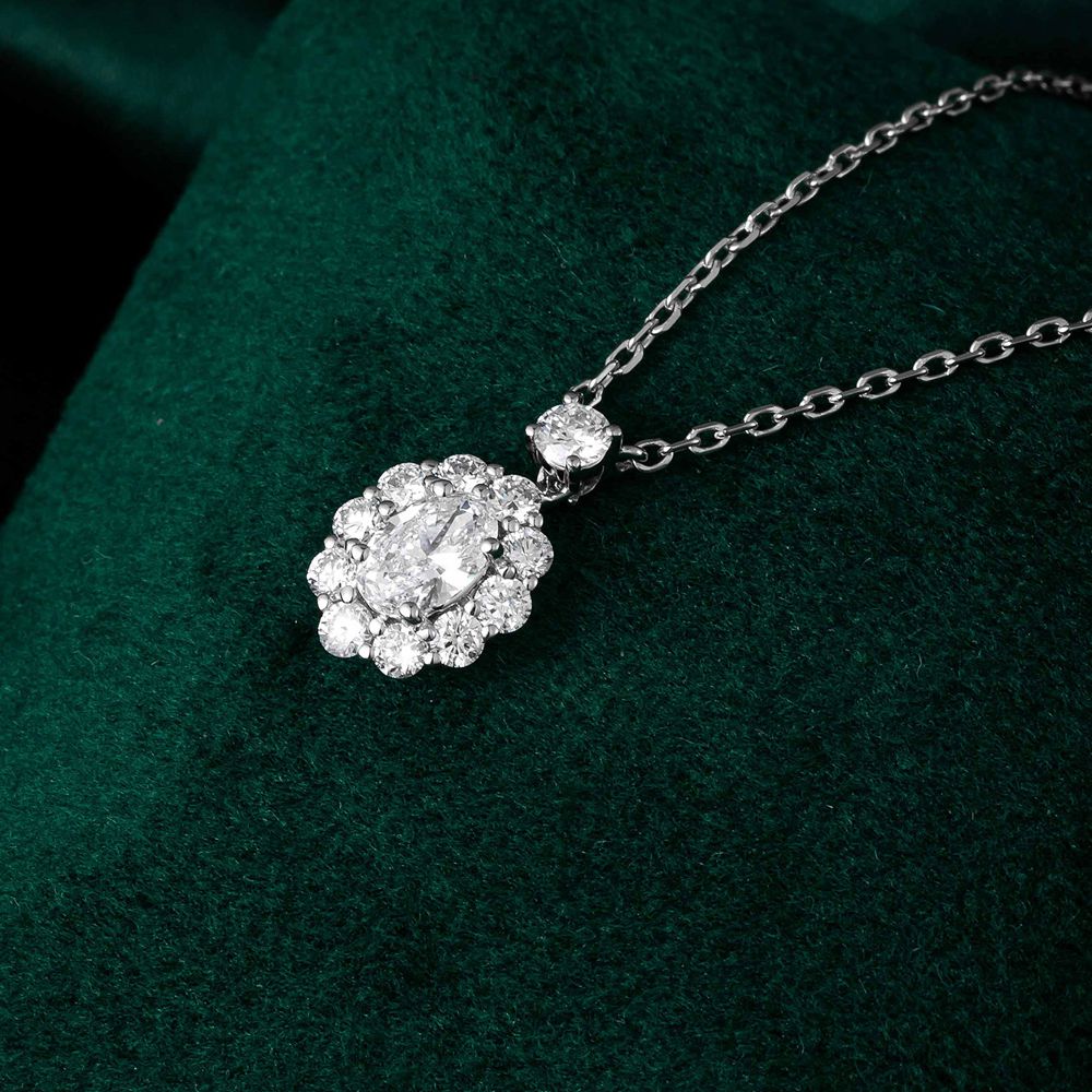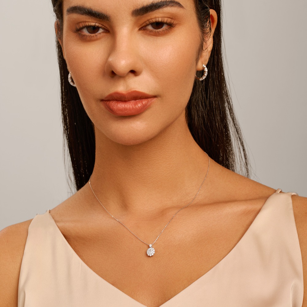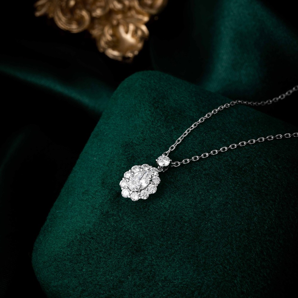 This exquisite lab-created diamond pendant features a brilliant center stone surrounded by a shimmering halo of pavé-set diamonds, creating the illusion of a larger gem. Perfect for dates, evenings out, or as a meaningful gift, this piece combines ethical elegance with timeless romance.