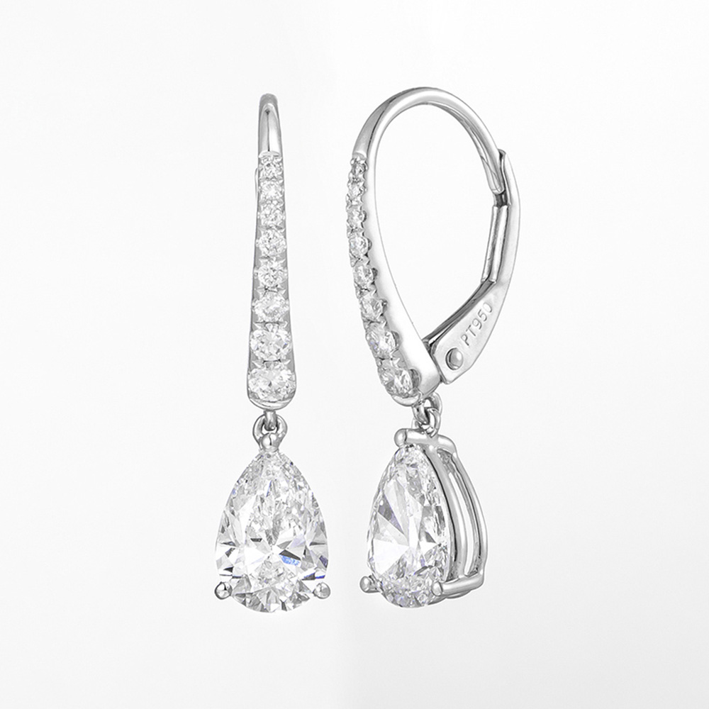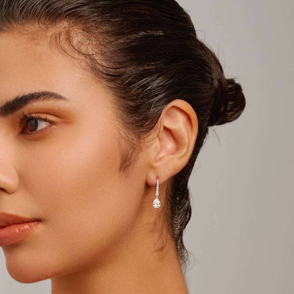 These elegant lab-created diamond earrings feature a brilliant pear-cut center stone suspended from a delicate sterling silver setting. Accented with pavé-set diamond details along the hook and connection points, they offer exceptional sparkle with every movement.